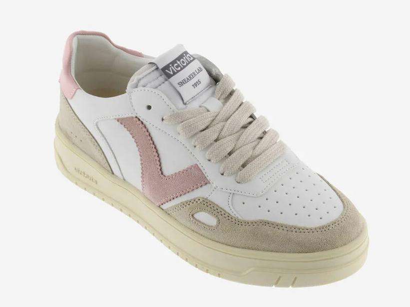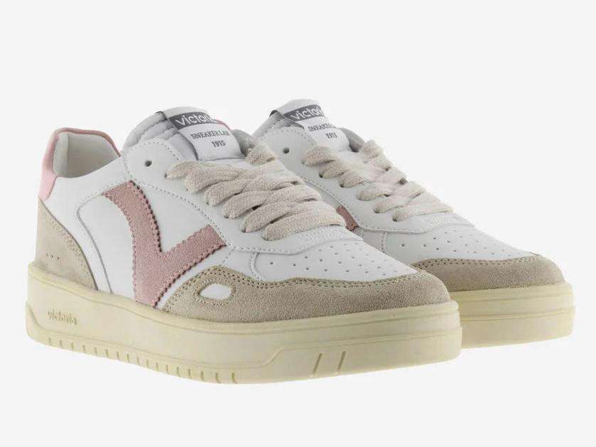 Scarpe sportive unisex in effetto pelle bianca con inserti colorati e in effetto casmocio. Contrastano la V di victoria laterale e il tallone con il logo del marchio in colori coordinati. Dettaglio a finestra sul lato. Punta traforata per favorire la traspirazione. Suola in TPR leggermente ambrata.