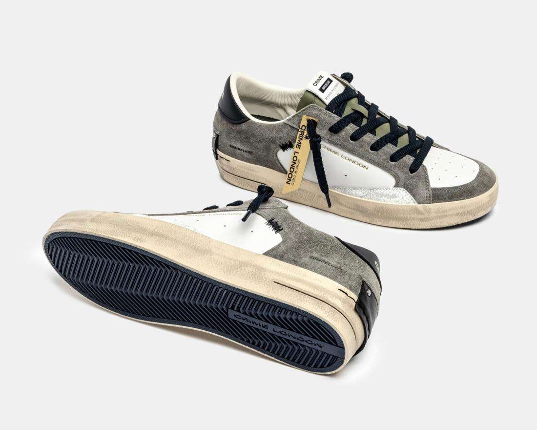 Tomaia in suede cemento, dettagli in cracklé bianco
