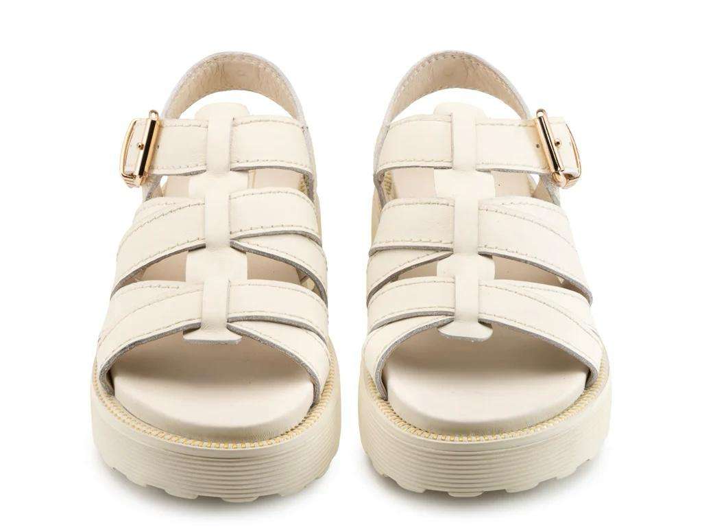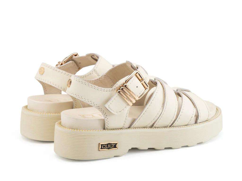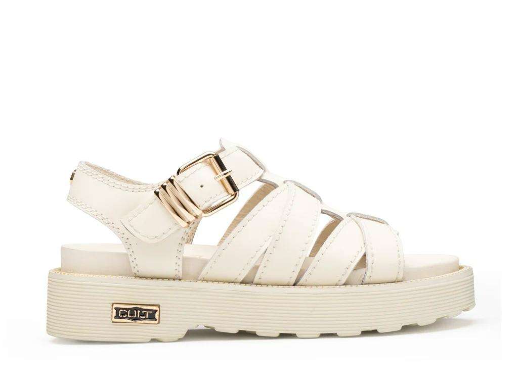 L’anima rebel di Cult sperimenta nuovi volumi in questo sandalo della collezione SS26, caratterizzato da un gioco di fasce in pelle off white che avvolgono il piede. Il modello è definito da una serie di listini paralleli con cuciture a vista e una robusta chiusura con maxi fibbia metallica color oro. La suola flatform scanalata, rifinita da un guardolo con dettaglio a catena e dal’iconico logo laterale, conferisce un’attitudine cool e glam-rock, ideale per chi cerca un look urban dal carattere forte e rigoroso.