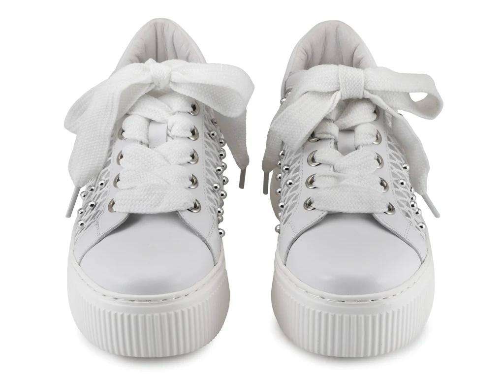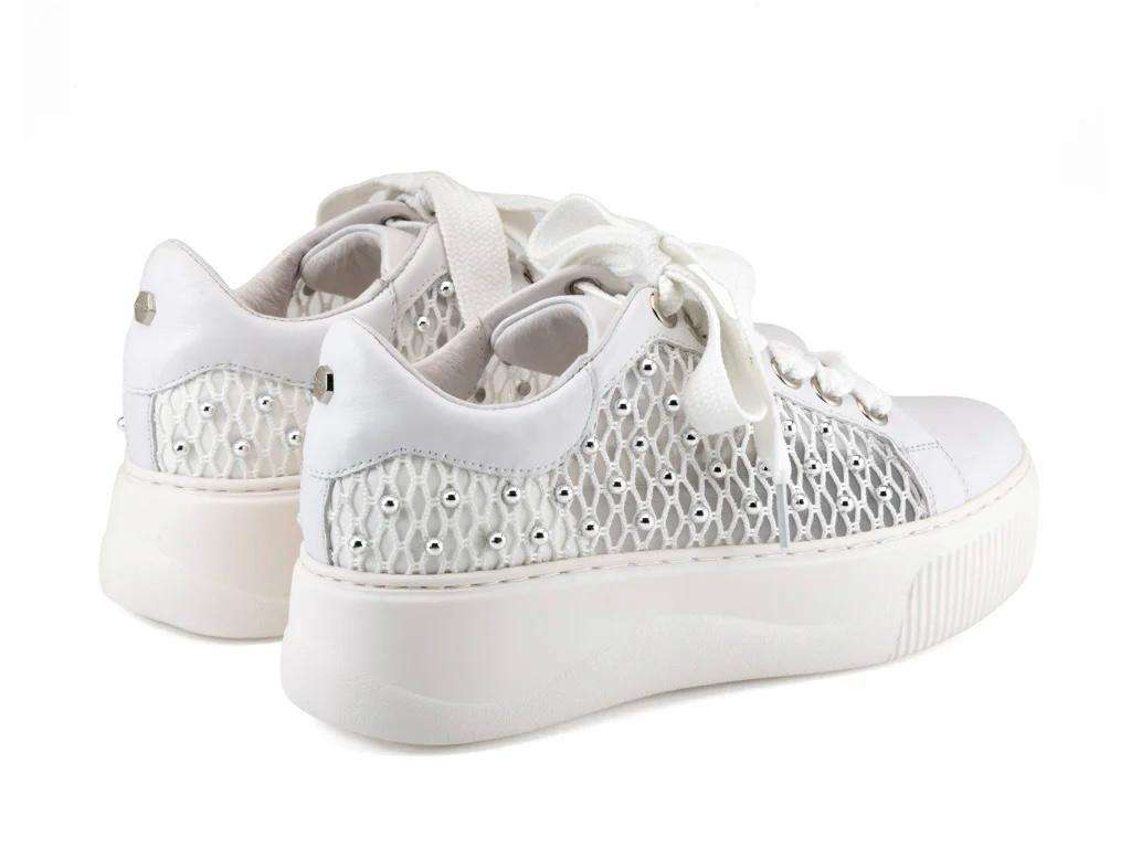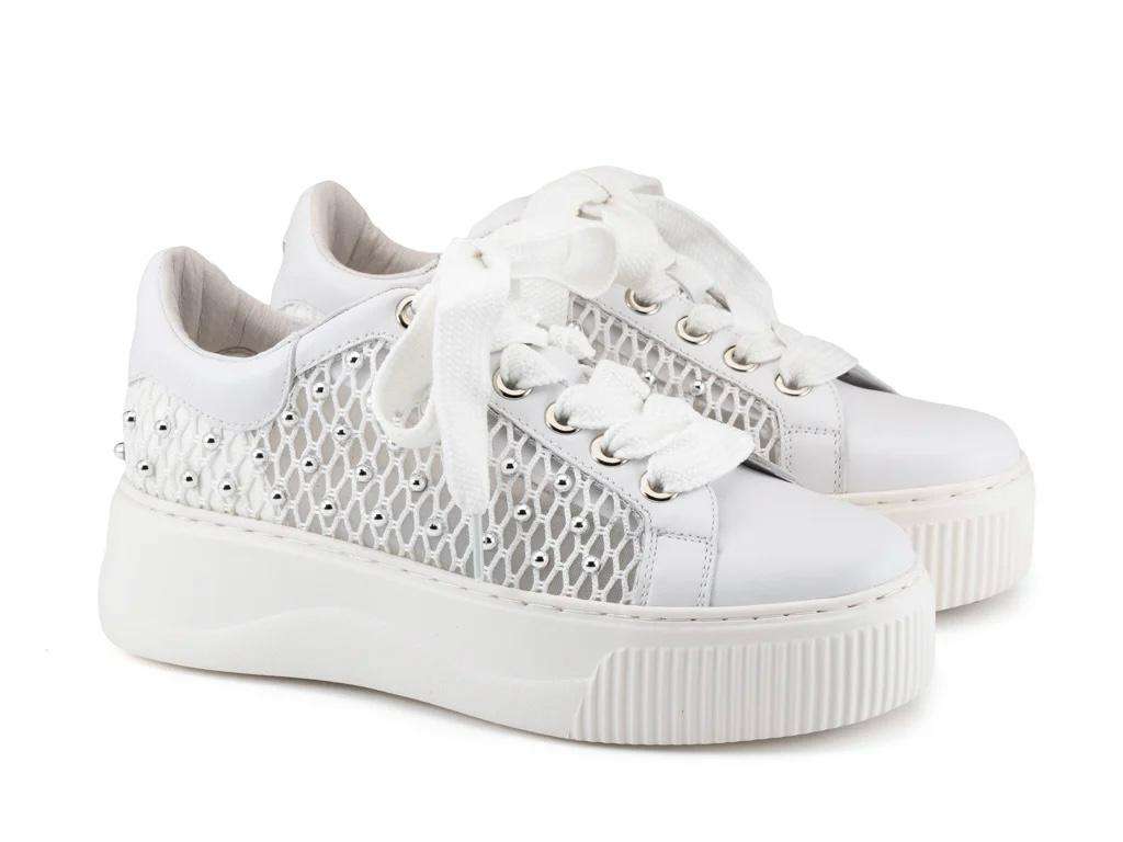 Trasparenze rock e attitudine urban: questa sneaker in pelle gioca con una texture a rete impreziosita da micro-borchie. La maxi platform iconica eleva un design audace, perfetto per un look indipendente che non passa inosservato