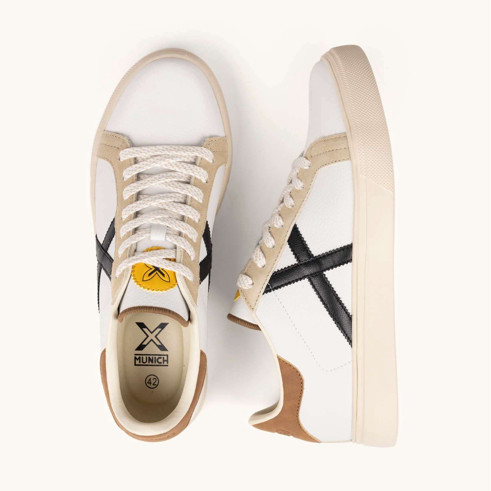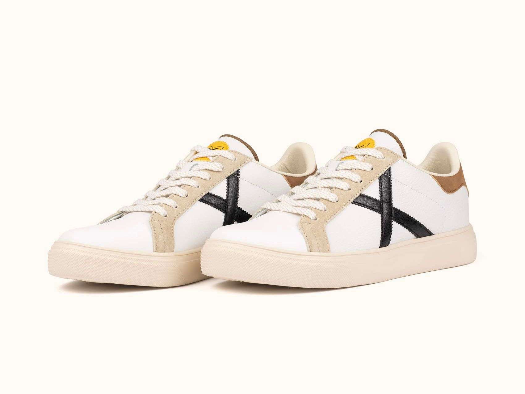 Queste sneakers in colore bianco con sottili dettagli in beige, nero e un rinforzo marrone sul tallone catturano l’essenza delle calzature sportive degli anni ’80. Il modello RETE si caratterizza per la sua fattura che combina materiali di alta qualità e una chiusura con lacci che garantisce una calzata ottimale per l’uso quotidiano. È una calzatura ideale per completare un look urbano casual, per camminare in città in tutta comodità o per chi cerca un’opzione con eredità sportiva e stile vintage nei propri momenti di svago.