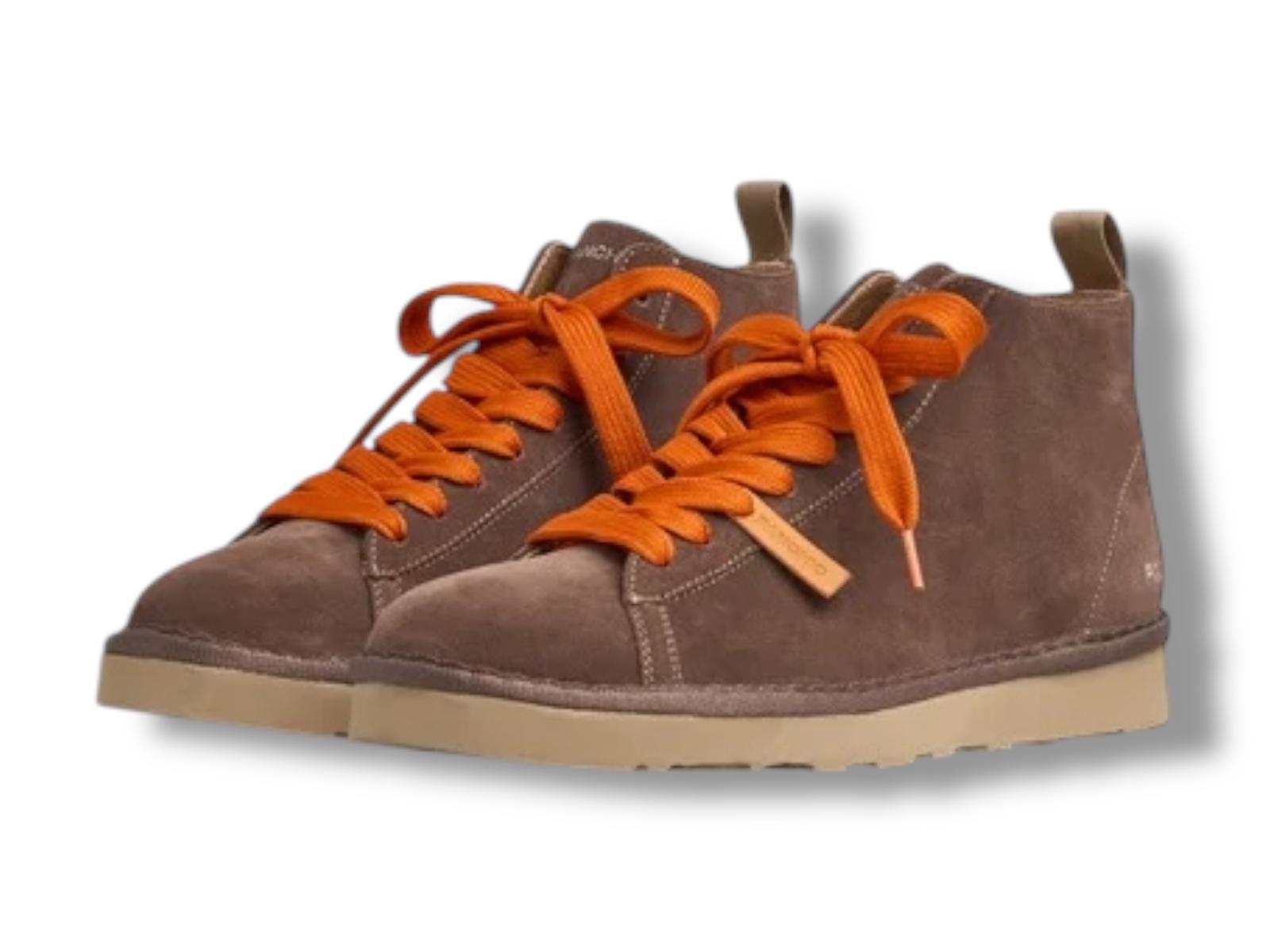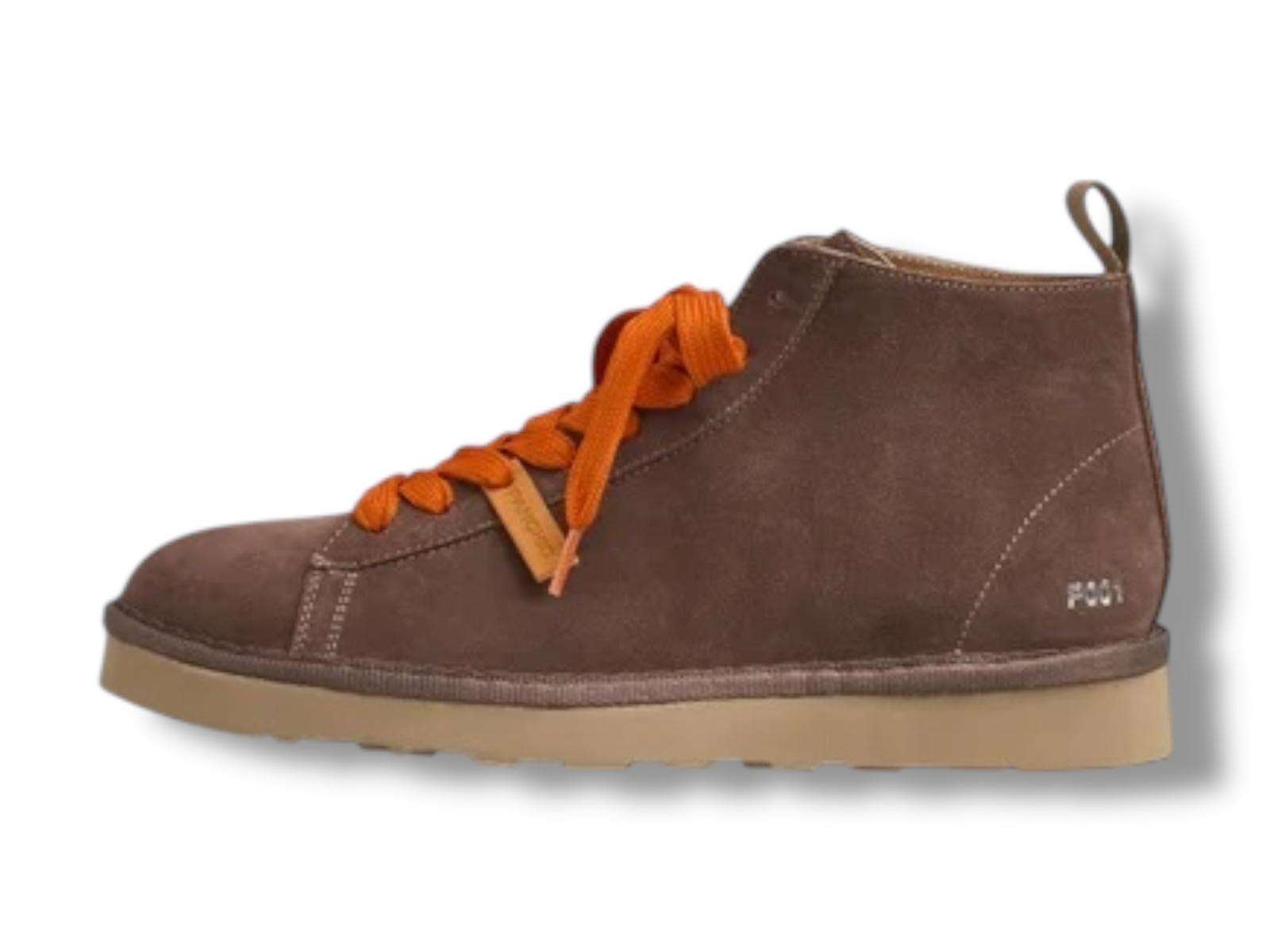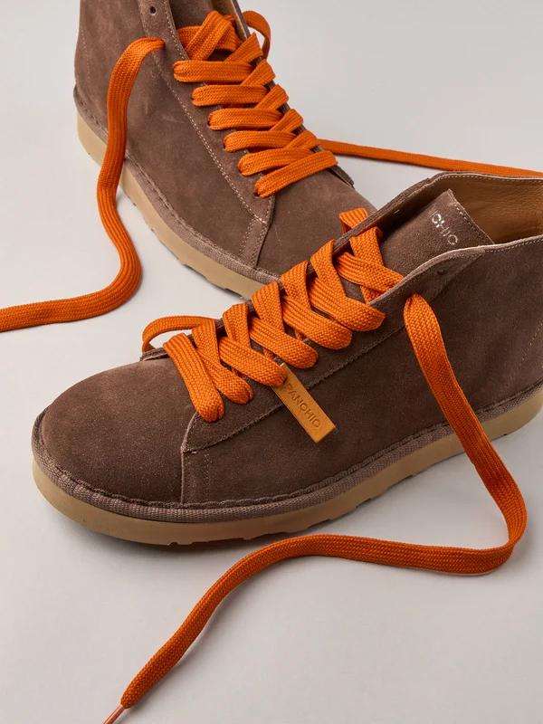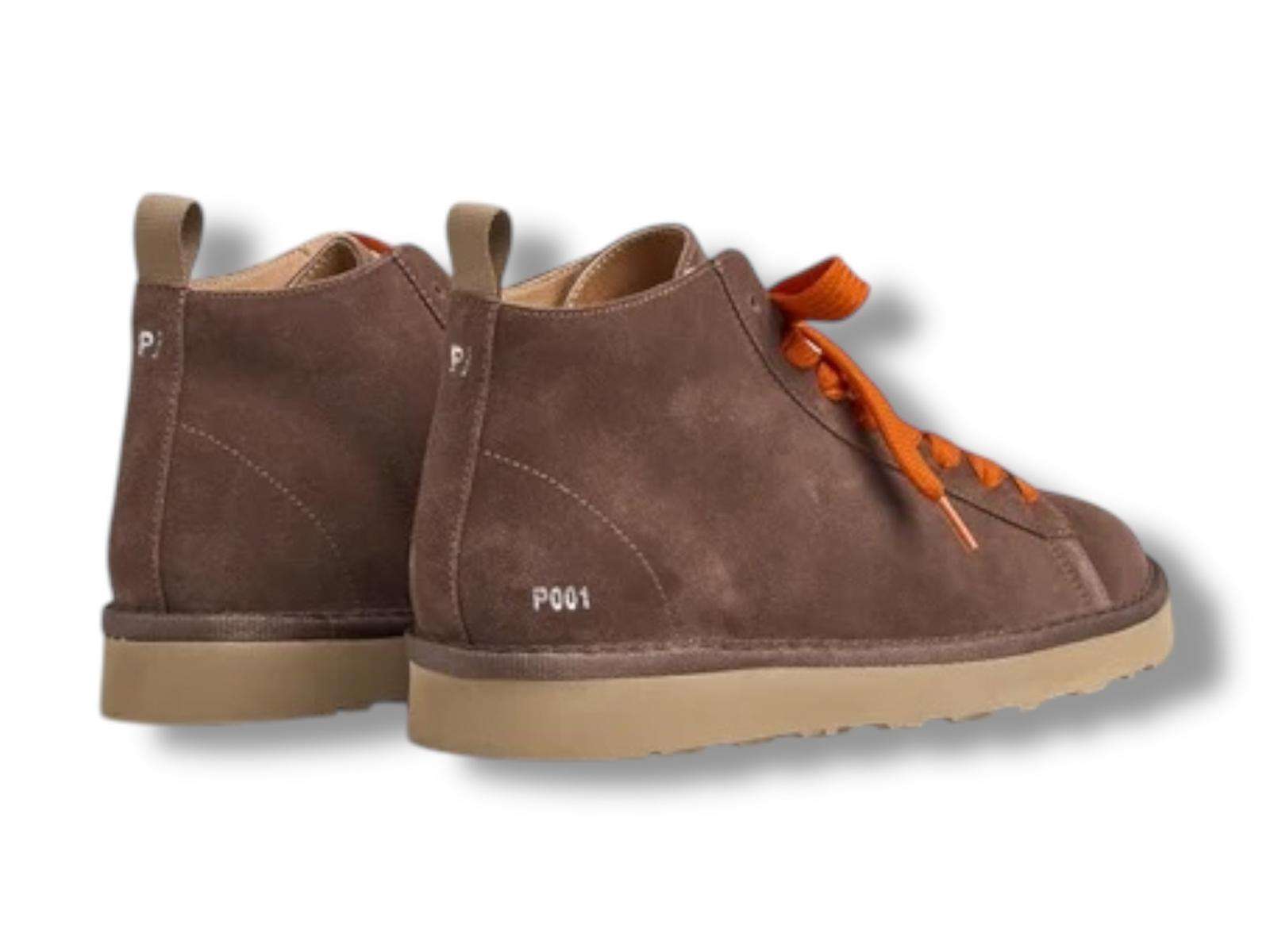 Polacchini uomo P001 con tomaia di camoscio marrone, lacci a trama larga arancio bruciato e fodera di microfibra. La P01 con le sue linee pulite rappresenta il perfetto equilibrio fra design e comfort.