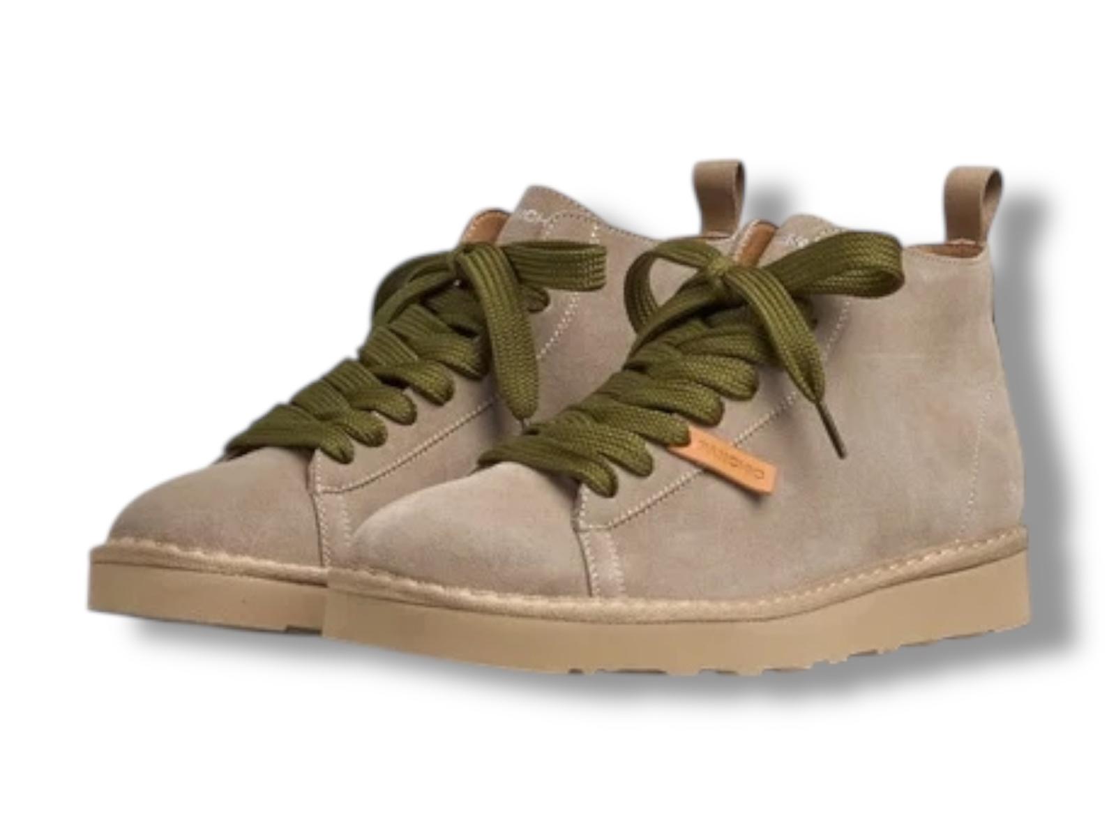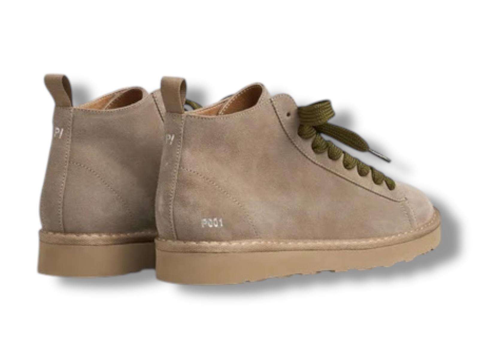 Polacchini uomo P001 con tomaia di camoscio marrone noce, lacci a trama larga verde oliva e fodera di faux-fur. La P01 con le sue linee pulite rappresenta il perfetto equilibrio fra design e comfort.