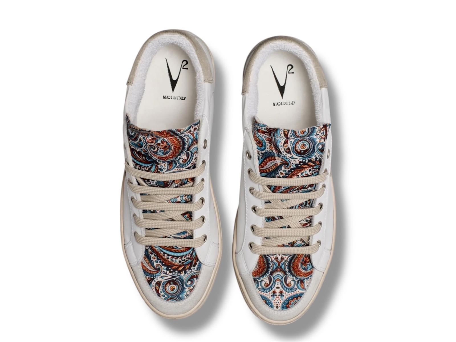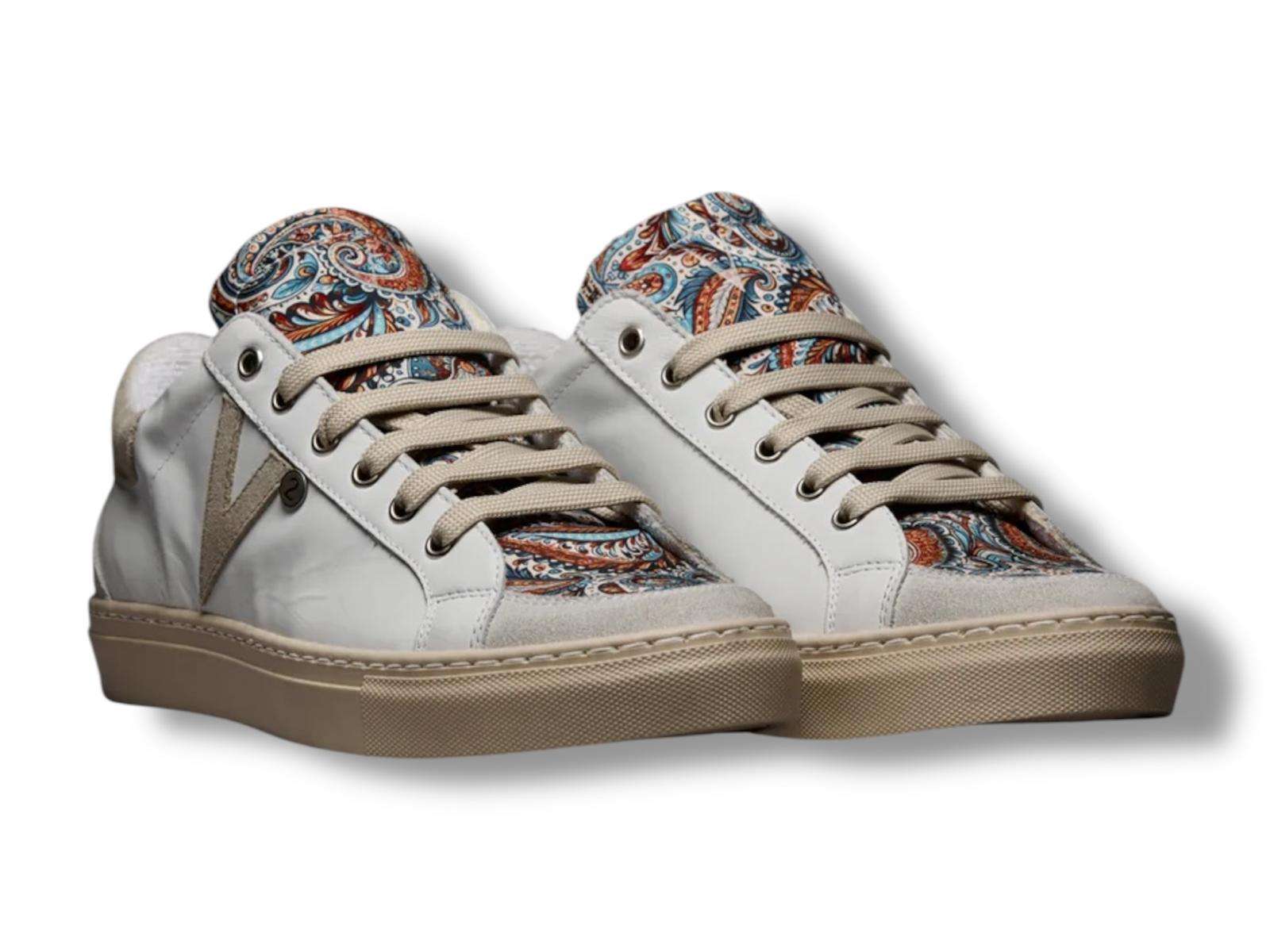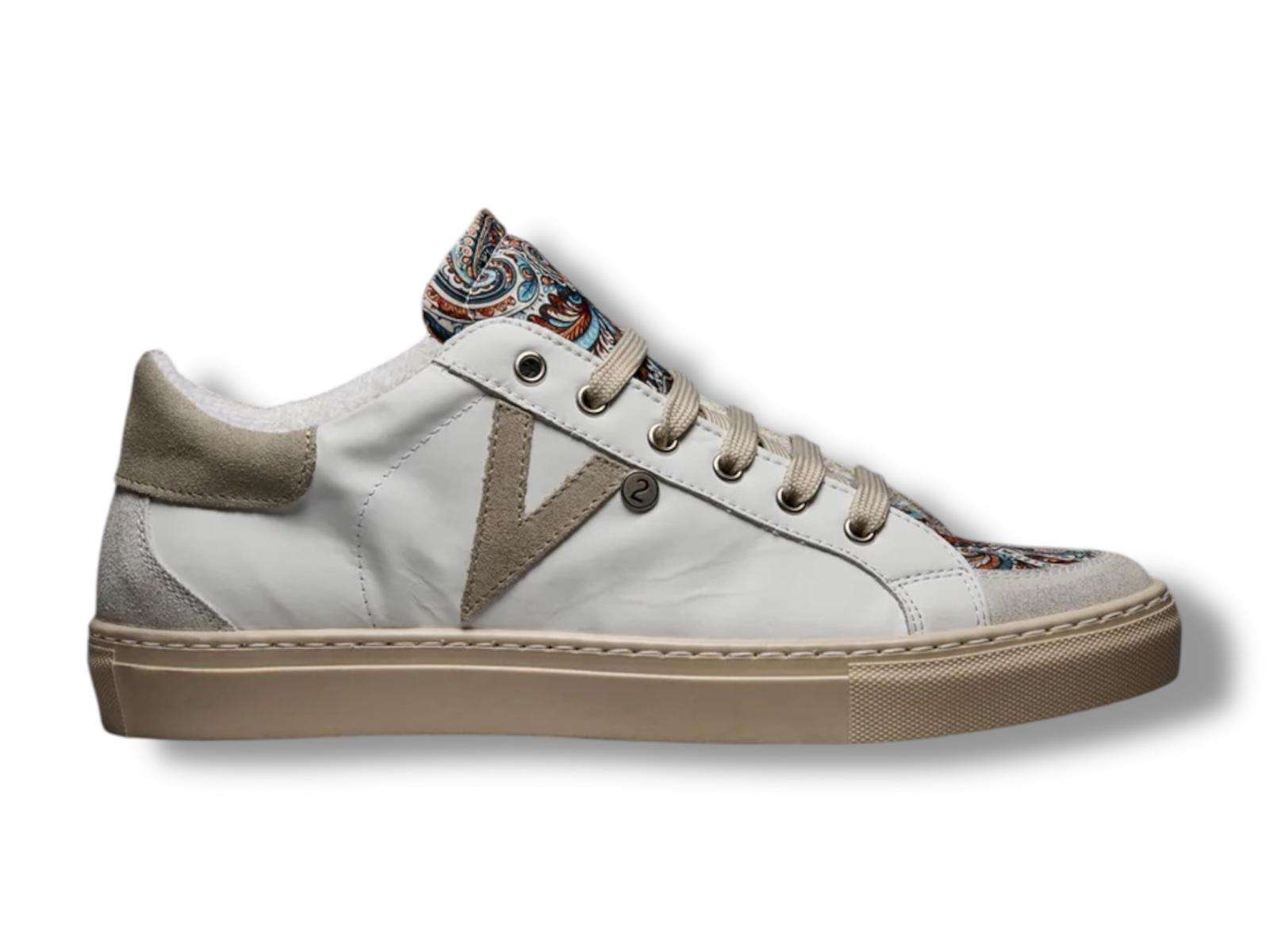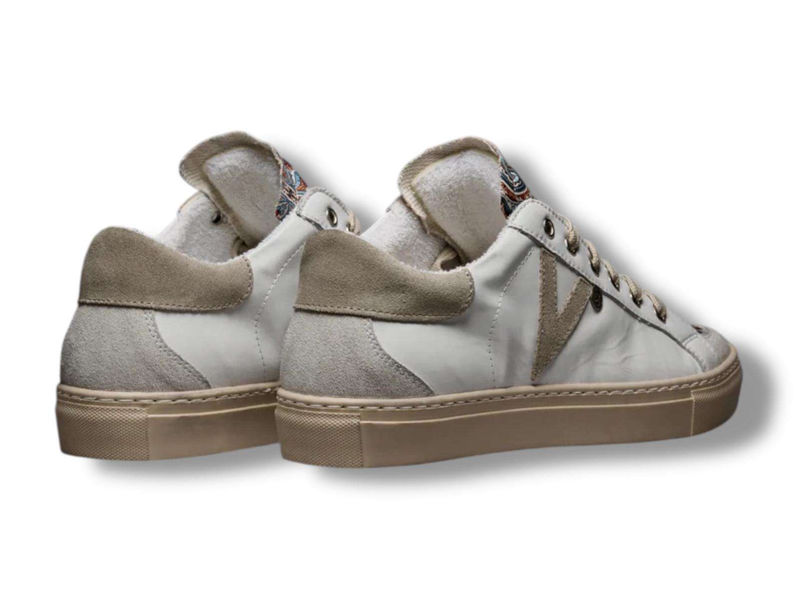 v2 brand sneakers uomo olympic a suola bassa in pelle bianca retro e inserto sabbia con linguetta in tessuto cachemire panna