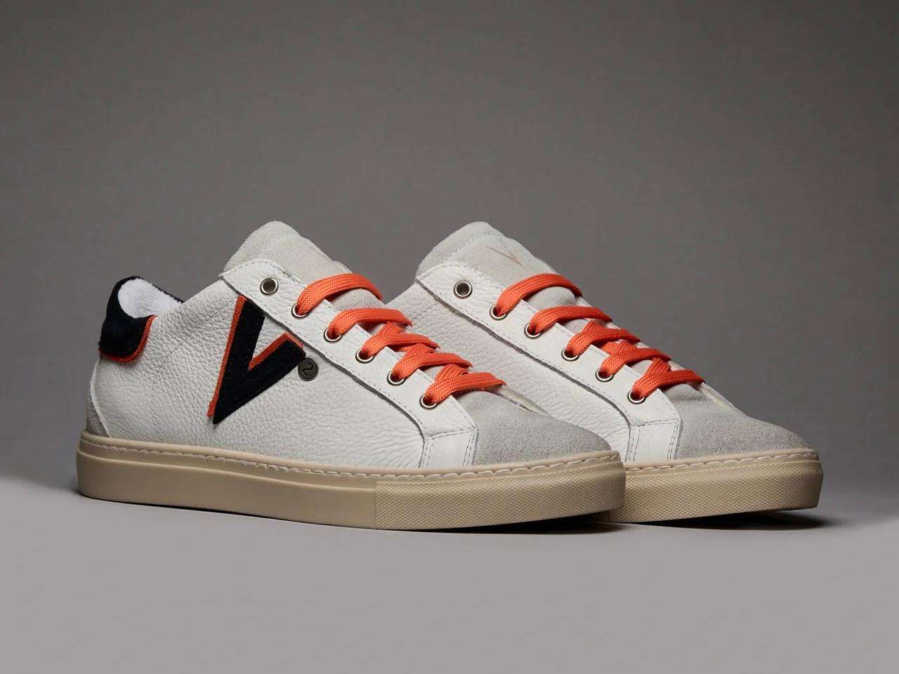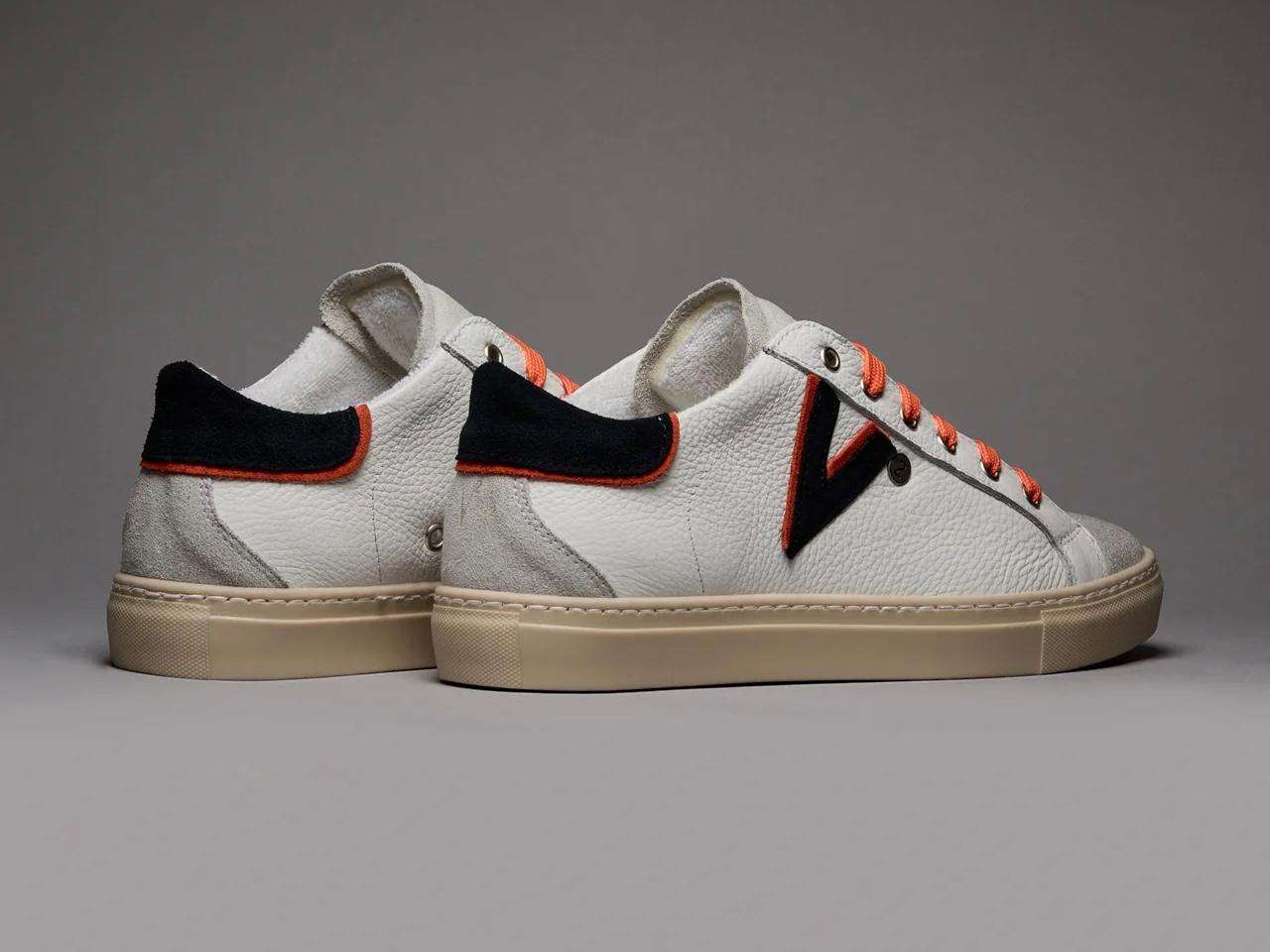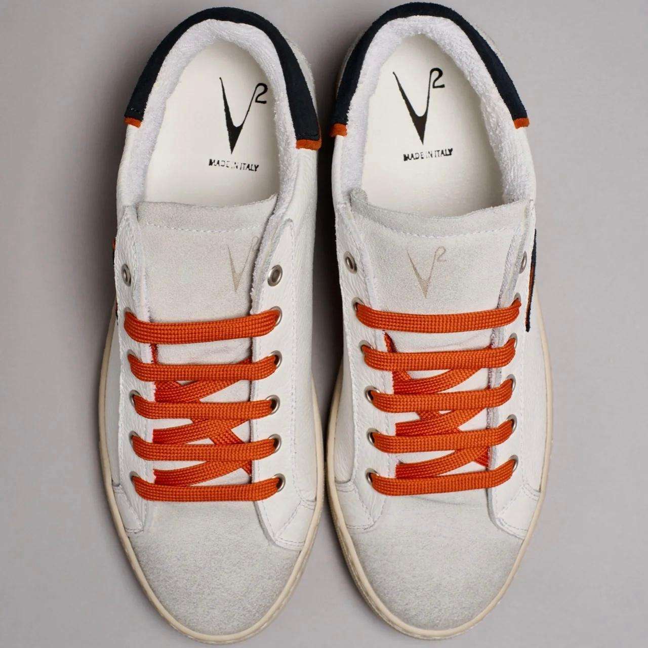 v2brand sneakers uomo olympic v a suola bassa in pelle martellata con inserto e retro bicolor blu e arancio